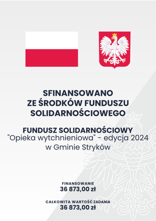 W ramach Funduszu Solidarnościowego Gmina Stryków na realizację w/w zadania otrzymała kwotę 36 873,00 zł.
